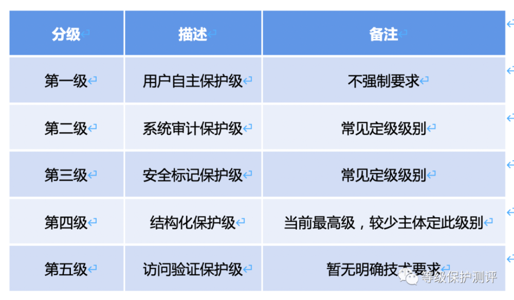 等級(jí)保護(hù)根據(jù)《GB 17859-1999 計(jì)算機(jī)信息系統(tǒng)安全保護(hù)等級(jí)劃分準(zhǔn)則》(網(wǎng)絡(luò)安全領(lǐng)域唯一一個(gè)強(qiáng)制標(biāo)準(zhǔn))規(guī)定共分五級(jí),分別是: